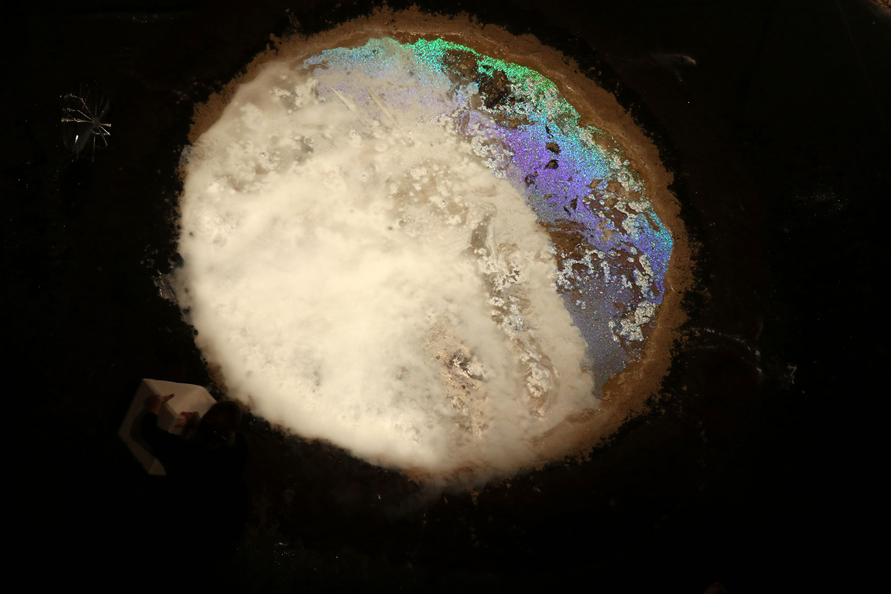 Een landschap van wachtende materialen, dat aardse woestijnen en hemelse ruimtes oproept. Tijdens de activering probeert Gwendoline Robin de trillingen en energieën van de materialen te horen, hun oscillaties naar de val toe, hun weerstanden met de fysieke eigenschappen van de plaats.